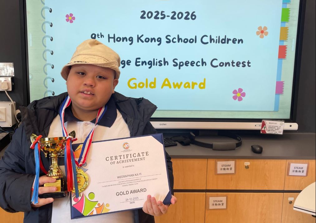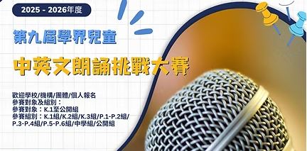 第九屆學界兒童中英文朗誦挑戰大賽本校學生麥浩敏、林子竣及張嘉兒於「2025–2026年度第九屆學界兒童中英文朗誦挑戰大賽(小五及小六組別)影片比賽」中,憑着自信沉穩的台風、清晰準確的發音及富感染力的演繹,從眾多參賽者中脫穎而出,榮獲英文朗誦金獎!