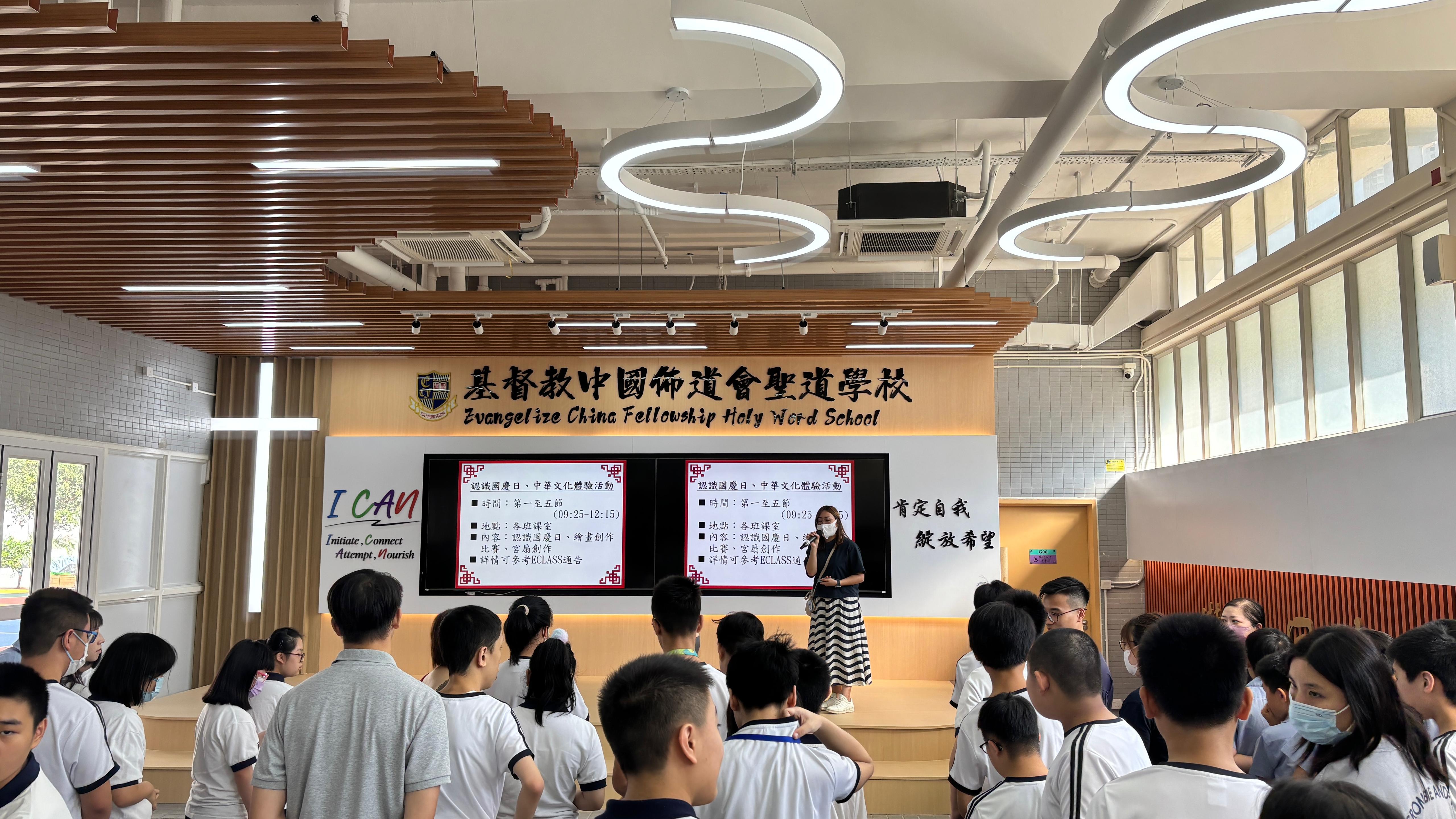 為培養學生的民族自豪感與國家身份認同,本校於9月30日舉行國慶主題活動。當日早會期間,老師於國旗下講話,向全體師生介紹國慶日的歷史背景與深遠意義。隨後,師生共同手持小國旗,排成「76」字樣拍攝大合照,場面壯觀,氣氛熱烈而隆重。當日藝術創作環節中,學生以畫筆及顏料為宮扇添上具中國特色的紋樣與圖案,既展現個人創意與審美能力,亦進一步加深對中華文化藝術的認識與欣賞。