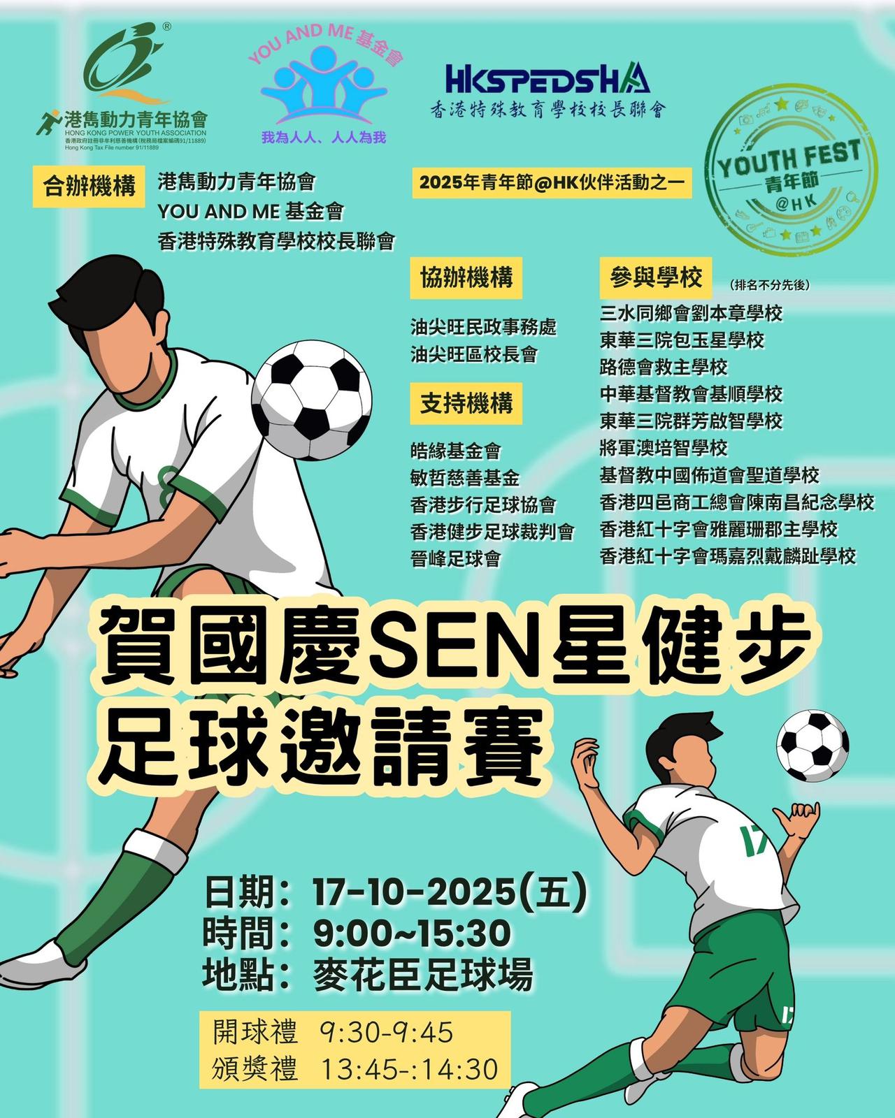 皓緣 X 港雋SEN星足球邀請賽由皓緣慈善基金、港雋動力青年協會及香港島青年聯會聯合主辦,得到基督教中國佈道會聖道學校全力支持的 2024 年青年節@HK 伙伴活動之一,SEN星足球邀請賽於 2024 年 10 月 8 日在基督教中國佈道會聖道學校盛大舉行。這項全港首次舉辦的特殊學校青年足球比賽旨在為特殊學校的學生提供展示足球才能的舞台,同時增進社會對特殊教育的關注和支持。