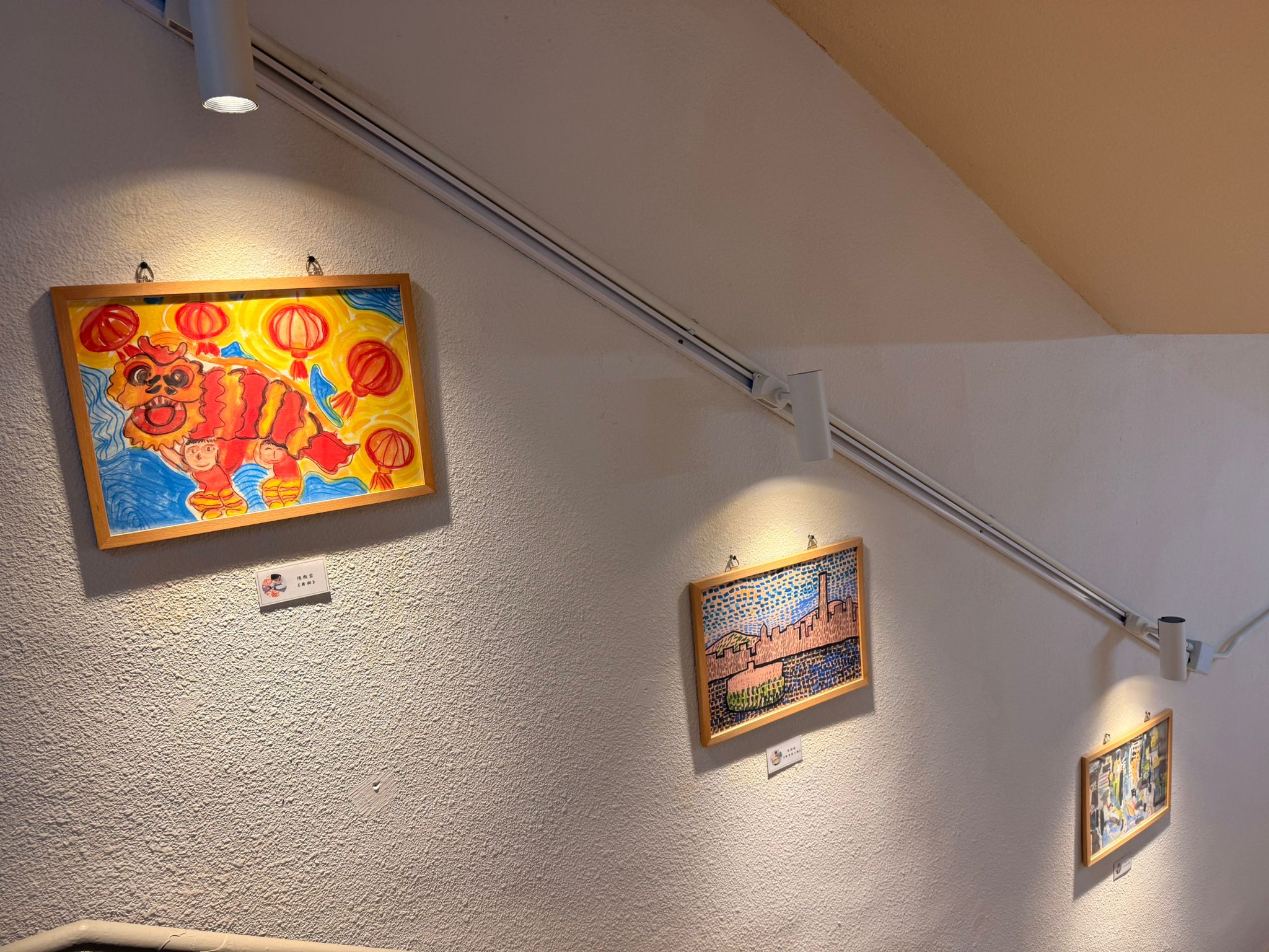 除了水墨畫,學生亦創作了以青花瓷為靈感的設計作品。藍白相間的紋飾,線條流暢優美,展現了學生對中國傳統工藝的細緻觀察力。而在描繪農曆新年的作品中,如舞獅與賀年場景,學生運用了大膽鮮豔的色彩,生動捕捉了節日的熱鬧與喜慶。這些畫作充滿童趣與活力,展現了新一代對傳統習俗的熱愛與傳承。