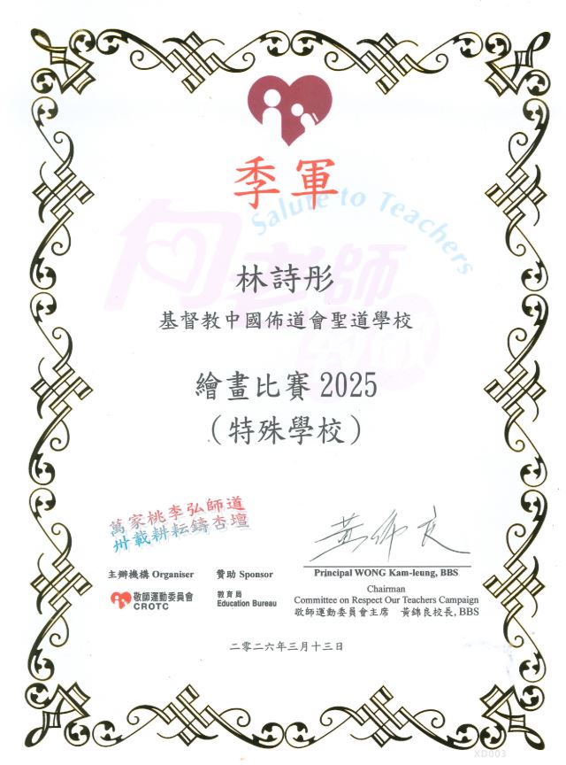 向老師致敬2025–繪畫比賽本校林詩彤同學於「向老師致敬 2025 – 繪畫比賽」中憑藉出色的創意與細膩的技巧,在眾多優秀參賽作品中脫穎而出,榮獲季軍佳績,表現令人欣喜。她於3月13日(星期五)出席「向老師致敬 2025 – 學生比賽頒獎典禮暨展覽會」並親自領獎,展現了對藝術創作的熱誠與實力,為校爭光,值得嘉許!