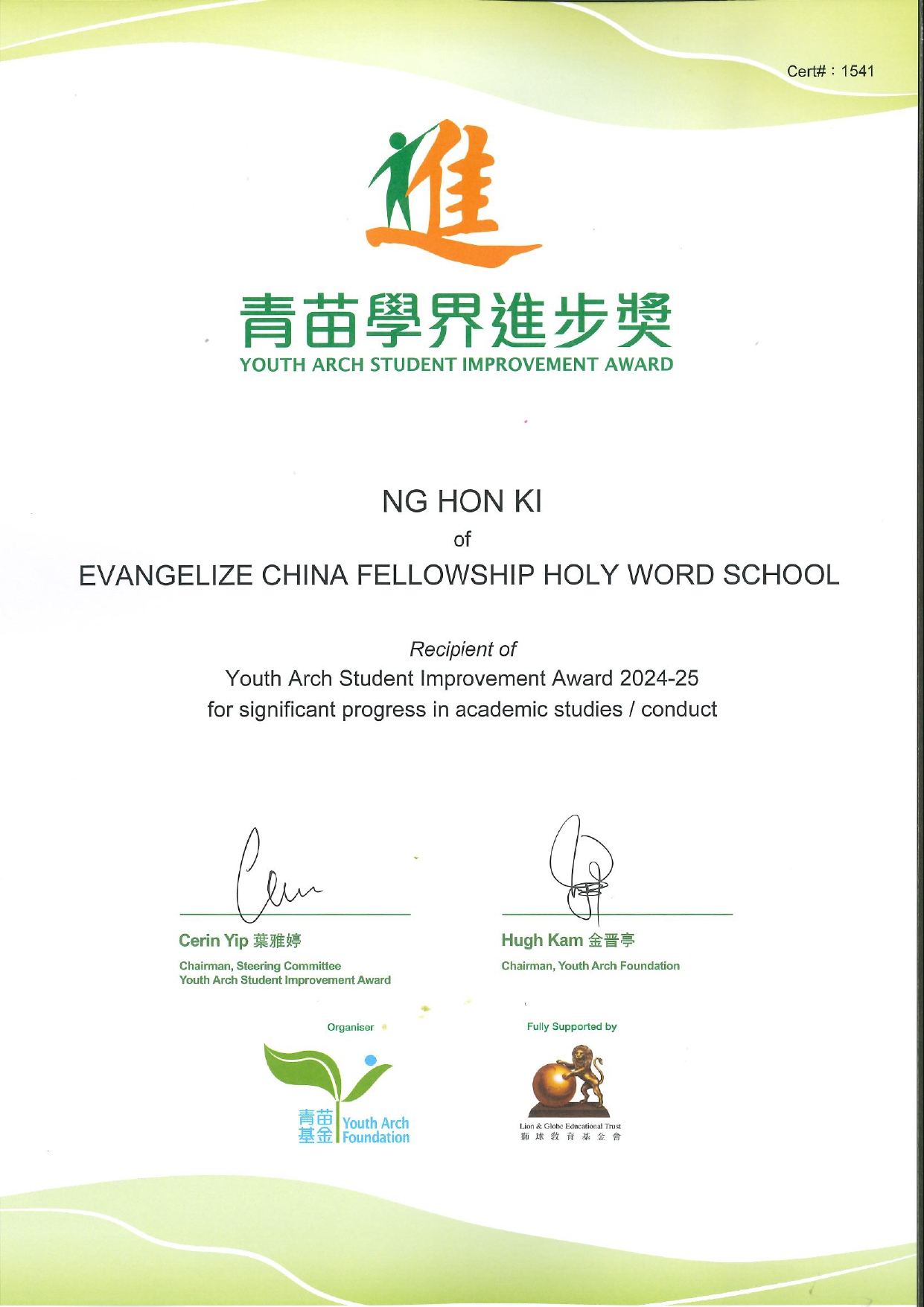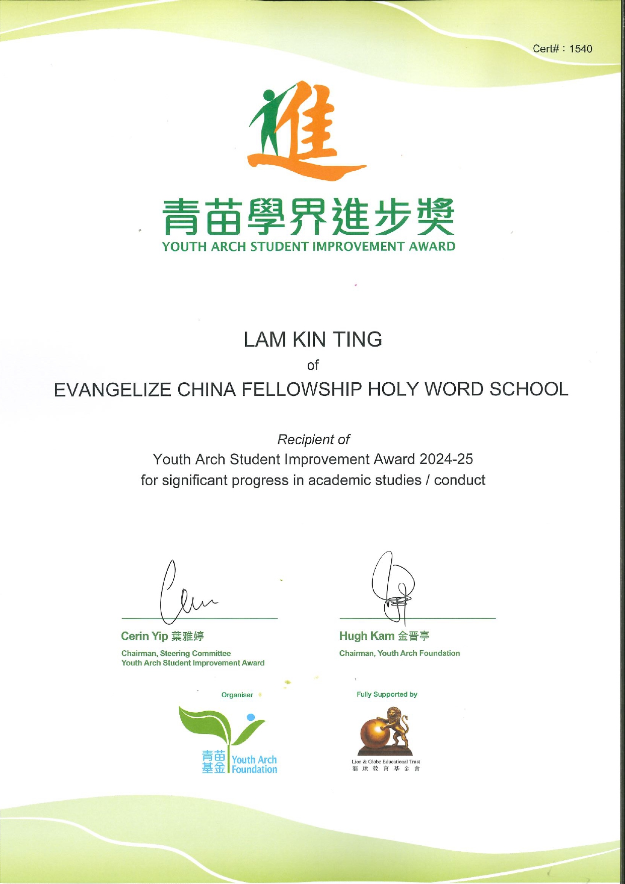 本校學生本校學生-高中二組-林建廷同學,高中二組-吳漢棋同學,高中一組 -黃心怡同學及高中三組 -白樂天同學獲得2024-2025青苗學界進步獎