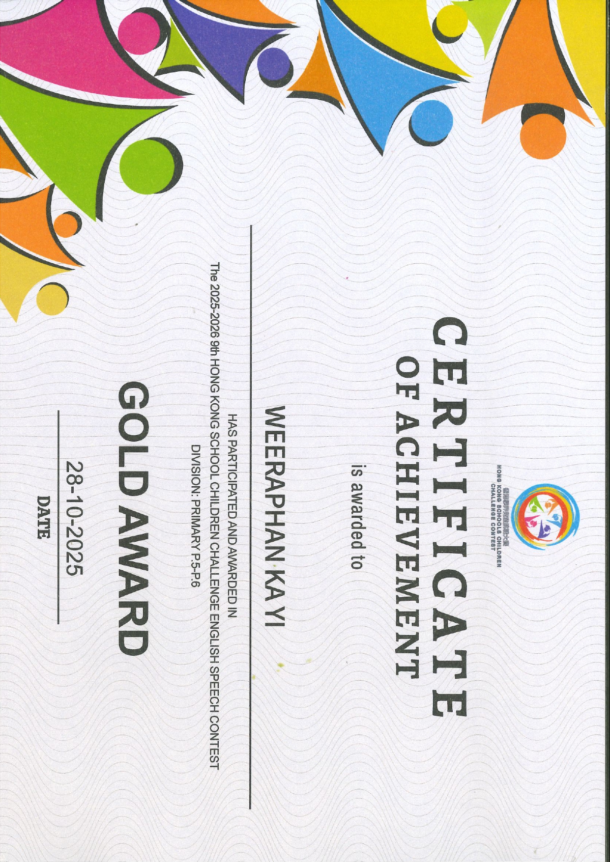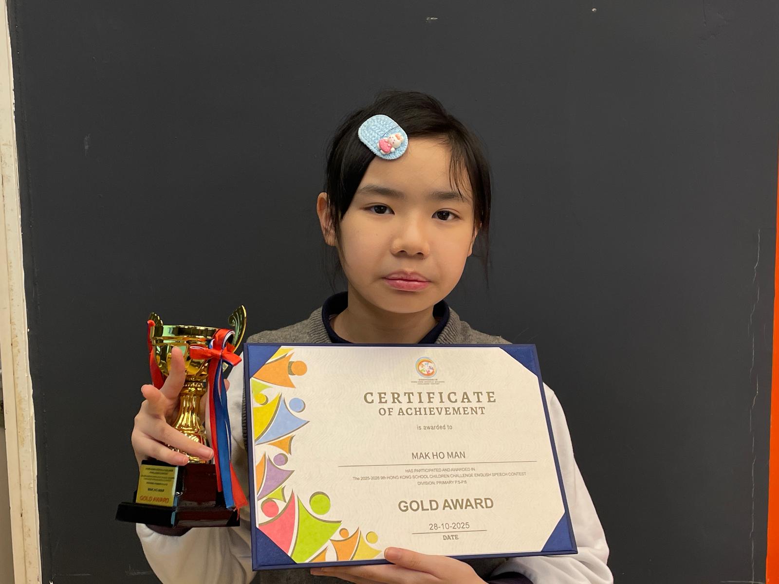 本校於2025-2026年度第九屆學界兒童中英文朗誦挑戰大賽中獲得金獎